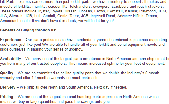 For your entire fleet of lift trucks, we provide the best prices on all our parts. Call now to get a quote on one of the parts or attachments we offer. We can be reached at: